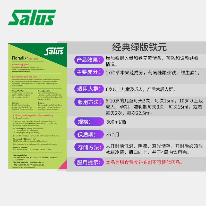 【随机溯源码】德国Salus莎露斯Floradix绿色版铁元草本滋补液500ml(新版)